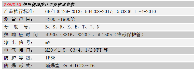 GKWD-50熱電偶溫度計是利用熱電效應為原理測量多種生產過程中從-200~1800℃范圍內的液體介質、氣體介質、蒸汽以及固體表面等的溫度,現已成為中高溫溫度遠傳儀表的理想選擇。